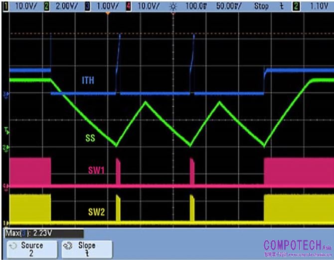 逐周期限流是峰值電流模式架構固有的優勢。打嗝模式限流提供額外保護。如果發生過流故障超過32個週期,則轉換器按照軟啟動電容的設定,在一段時間內停止切換。這段間隔時間結束之後,切換操作透過軟啟動恢復切換。如圖4所示,在故障期間,轉換器按相對較短的週期切換,這使得MOSFET和電感受到的熱應力大幅降低。
