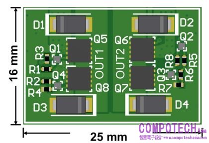 圖4:H橋和基礎周圍電路的離散實現;PCB面積為16mm x 25mm或400mm2