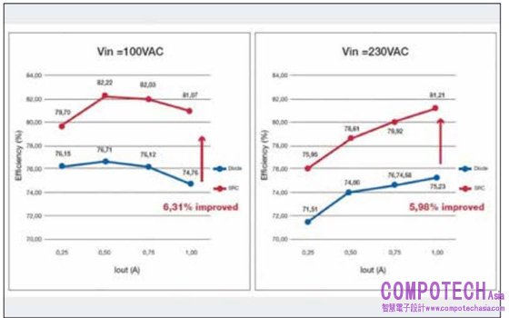 圖 :二極體整流和 SR 控制器之間的功率轉換效率比較