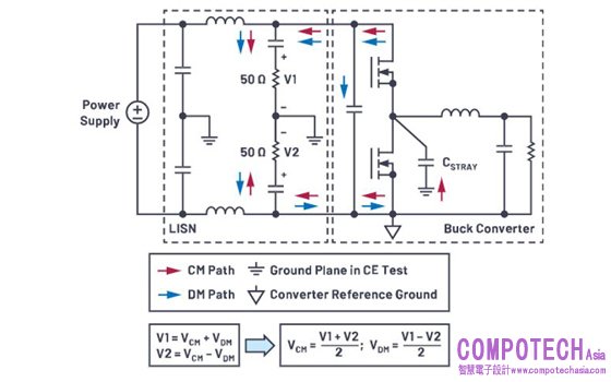 圖1.降壓轉換器中的CM雜訊路徑和DM雜訊路徑