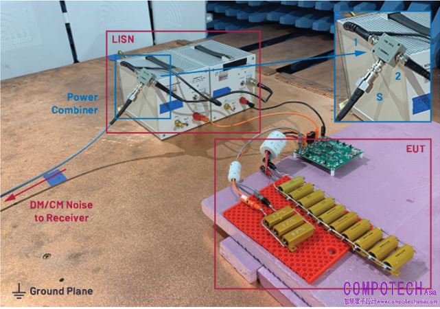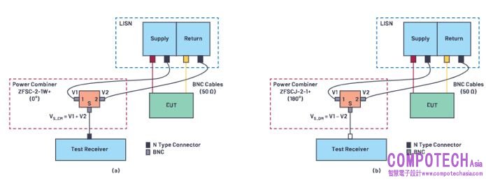 測試設定如圖3所示。功率合成器已增加至標準CE測試設定中。LISN針對電源線和返回線的輸出分別連接到合成器的輸入埠1和輸入埠2。0°合成器的輸出電壓為VS_CM = V1 + V2;180°合成器的輸出電壓為VS_DM = V1 – V2。