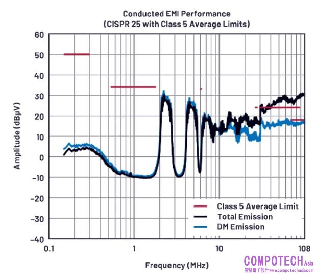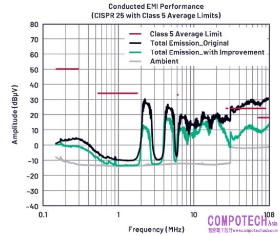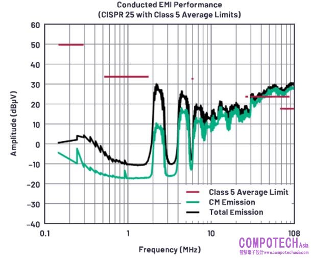 因此,該展示板展示了專門解決CM雜訊的辦法。CM雜訊的來源之一是切換電路中的高dV/dt訊號。透過增加閘極電阻來降低dV/dt,可以降低該雜訊位準。如前所述,CM雜訊透過雜散電容CSTRAY穿過LISN。CSTRAY越小,在LISN中檢測到的CM雜訊就越低。為了縮減CSTRAY,應減少此展示板上切換節點的覆銅面積。此外,轉換器輸入端增加了一個CM EMI濾波器,以獲得高CM阻抗,從而降低進入LISN的CM雜訊。透過進行這些方法,30 MHz至108 MHz範圍的雜訊得以充分降低,從而符合CISPR 25 Class 5標準,如圖7所示。