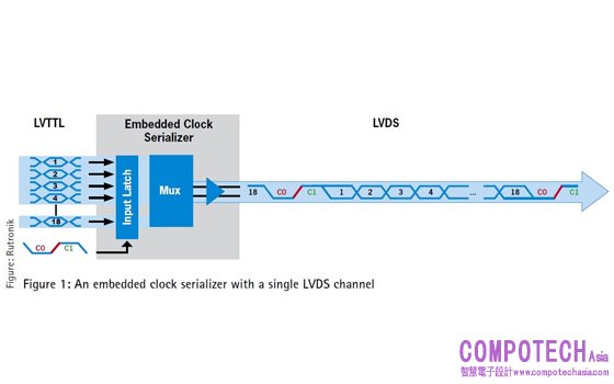 LVDS是一項高效節能的單向連接技術,該技術使用兩條銅纜之間的電壓差來傳輸資訊。LVDS發送器基於四個序列差動對(differential pairs)上的輸入時鐘,對高達24位元資料進行編碼(見圖1),利用一個終止電阻可防止訊號反射回訊號源頭。