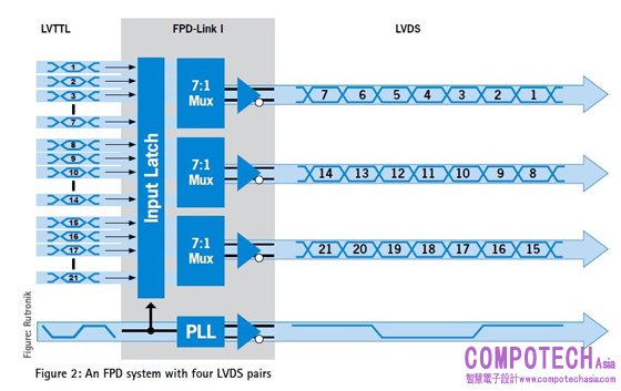 圖2顯示了具有四根LVDS絞線對(wire pairs)的FPD-Link結構。四根電纜中的三根用於傳輸圖形和視訊訊號,而第四根電纜用於傳輸LVDS時鐘訊號。多工器電路將平行的圖形和視訊訊號序列化,並通過差分對進行傳輸。因此,與需要22根電纜的其他方案相比,這僅僅需要三根電纜,並且改善了電磁相容性。