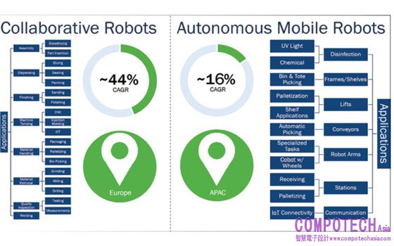 市場專家預估,全球工業自動化市場,尤其是機器人,將以約30%的複合年增長率(CAGR)成長。協作機器人 (Cobots) 和自主行動機器人 (AMR) 是自動化領域內正在發生巨變的關鍵技術。COVID-19大流行改變了機器人在工業製造中發揮作用的方式。這可歸咎為幾方面,首先,由於居家購物帶來電子商務的快速成長,已大大重構自動化在製造業中的作用。其次,產業領袖已意識到機器人解決方案對於保持社交距離準則至關重要。最後,以雲端為基礎的機器人和消毒機器人等創新技術在機器人領域相對較新,疫情使其迅速受到關注。總體而言,