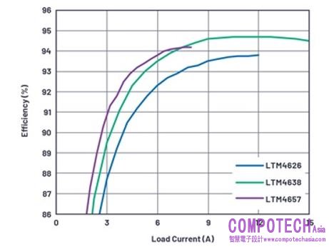圖2. 使用推薦的切換頻率, VIN = 12 V、 VOUT = 5 V 時,LTM4626、LTM4638 和LTM4657的效率比較結果。