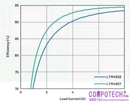 圖4. LTM4626和LTM4657在DC2989A展示板上採用相同配置,在1.25 MHz時的效率比較結果。