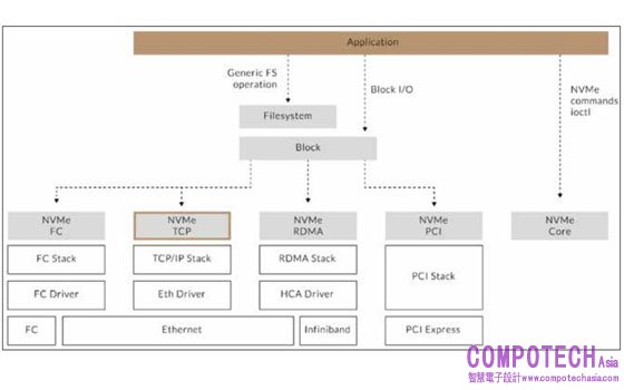 圖:NVMe/TCP 可與 Linux 內核中的現有 NVMe 協議無縫整合 (seamless integration)