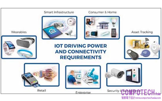 物聯網終端裝置的典型特徵是功耗極低、體積小巧的裝置,可能採用自行供電或設計為只要一顆鈕釦型電池,便能持續運作多年。實際上物聯網包含眾多種類的裝置,包括智慧感測器、資料記錄裝置、智慧建築控制器、安全裝置 ( 如入侵者偵測器和網路攝影機 ),還有許多其他零售、企業及基礎設施產品應用 ( 圖 1)。