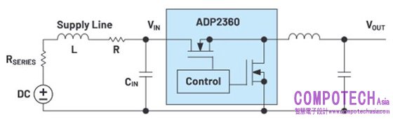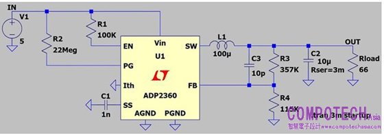 圖3所示為 ADP2360 降壓轉換器的模擬電路。此處顯示了使用理想電壓源產生輸入電壓IN的簡化表。由於沒有為電壓源定義內部電阻,也沒有為電壓源和開關穩壓器之間的電源線提供寄生值,定義的電壓始終應用於ADP2360的VIN接腳。因此,無需增加輸入電容(CIN)。但是,在現實世界中,由於電壓源和電源線並不理想,因此開關穩壓器總是需要輸入電容。如果LTspice等模擬環境也用於檢查不同輸入電容的行為,則必須使用具有內部電阻的電壓源和具有電阻和電感寄生值的電源線,如圖2所示。