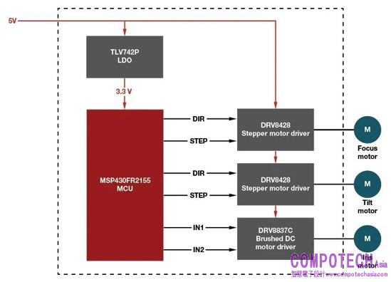 兩個DRV8428步進電機驅動器通過精密的細分驅動器(1/256微步進)和電流可調節功能實現焦距和傾斜控制,其作用等同於直流電機。另一個DRV8837C有刷直流電機驅動器用於控制光圈,可保護系統免受短路、欠壓和溫度過熱的影響。該解決方案可提供多種模式,實現超平滑和穩定的運動曲線。
