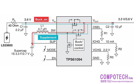 在整個溫度範圍內,超級電容器可提供的能量保持不變。通常情況下,使用混合層電容器 (HLC) 或雙電層電容器 (EDLC) 作為電源緩衝器可提高脈衝負載能力。但是,這些無源器件內存儲的能量取決於電池電壓。溫度降低時,電池電壓也會隨之下降,這會削弱 HLC 或 EDLC 的脈衝負載能力,並增大電池的電源電流。要解決這個問題,TPS61094 會使超級電容器的電壓保持穩定,無論溫度如何變化都不會改變電壓。