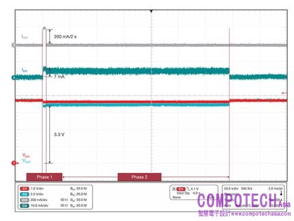 限制電池的峰值電流。在 Buck_on 模式下為超級電容器充電時,或在補充模式下使用電池對 VOUT 端的重負載供電時,TPS61094 均可以限制其峰值輸入電流。圖 1 顯示了 TPS61094 的配置,圖 2 顯示的是 VOUT 端有 200mA 和 2s 負載脈衝時的電池峰值電流。在第 1 階段重負載條件下,峰值電流限制在 7mA。在第 2 階段負載釋放後,器件以 10mA 的恒定電流對超級電容器充電。當超級電容器的電壓經過充電恢復至 2.0V 時,器件會停止充電,但仍處於 Buck_on 模式。