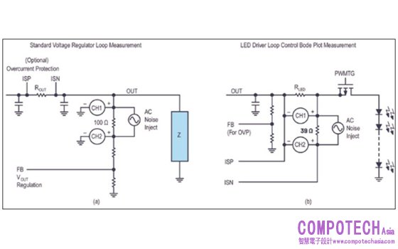 圖: 切換調節器控制迴路波德圖測量,具有網路分析儀,用於 (a) 電壓調節器和 (b) LED 驅動器。為了進行測量,控制迴路斷開,正弦波擾動進入高阻抗路徑,同時測量由此產生的控制迴路增益和相位,使設計人員能夠量化迴路的穩定性。