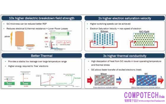 近年來,電力電子領域最重要的發展是所謂的寬能隙 (WBG) 材料的興起,即碳化矽 (SiC) 和氮化鎵 (GaN)。WBG 材料的特性有望實現更小、更快、更高效的電力電子產品。WBG 功率元件已經對從普通的電源和充電器到太陽能發電和能量存儲的廣泛應用和拓撲結構產生了影響。SiC 功率元件進入市場的時間比氮化鎵長,通常用於更高電壓、更高功率的應用。