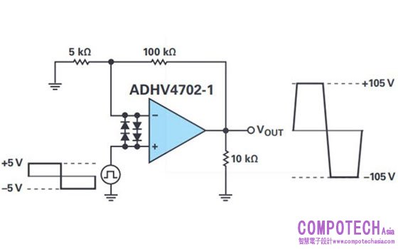 圖1. ADHV4702-1輸出擺幅電路及能力。