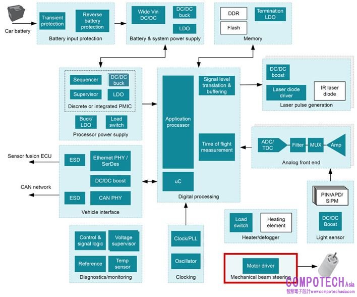 典型的雷射雷達模組由光源和感測器組成,可實現120度FOV。遺憾的是120度的視場對於自動駕駛環境來說遠遠不夠。要實現360度全方位FOV,需要用一個由置於旋轉平臺上的光源和感測器組成的機械掃描雷射雷達將汽車周圍的資訊傳給汽車的高級駕駛輔助系統。旋轉平臺以能讓光源和感測器實現360度無縫掃描的速度旋轉,準確回饋圖像位置。鑒於平臺重量比較輕,可以使用約40W的電機。