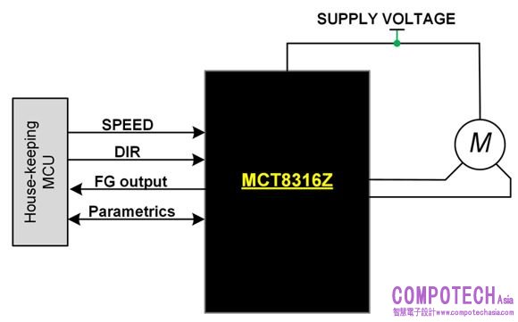 也可以使用集成了控制演算法的電機驅動器(如MCT8316Z)來驅動BLDC電機,該電機驅動器集成了感測器梯形控制,無需進行電機控制軟體發展。MCT8316Z集成了MOSFET,該MOSFET高側和低側相加RDS(on)與DRV8316一樣,也是95mΩ。外部搭配內務處理型MCU,可與MCT8316Z進行通信以設置配置參數並提供簡單的旋轉命令(如速度和方向)。