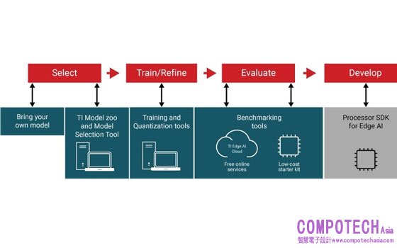 從模型選擇到在處理器上部署,TI可免費提供相關工具、軟體和服務,為您深度神經網路(DNN)開發工作流程的每一步保駕護航。下面讓我們來瞭解如何不借助手動工具或手動程式設計來選擇模型、隨時隨地訓練模型並將其無縫部署到TI處理器上,從而實現硬體加速推理。
