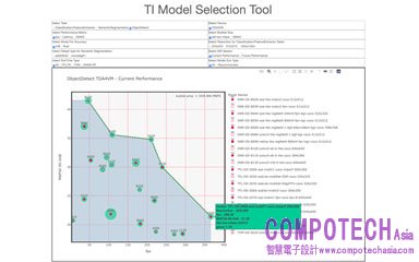 Model Zoo囊括數百個模型,TI模型選擇工具(如圖1所示)可以幫助您在不編寫任何代碼的情況下,通過查看和比較性能統計資料(如推理輸送量、延遲、精度和雙倍數據速率頻寬),快速比較和找到適合您AI任務的模型。