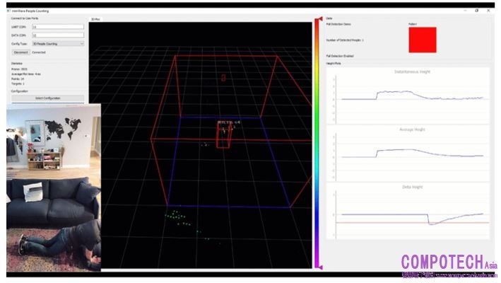 以指示跌倒的雷達點雲為例,圖2用綠點表示點雲,並為這一簇點雲分配了一條紅色軌跡。右圖顯示了人的暫態高度和平均高度,可以使用演算法來檢測一個人是否跌倒。