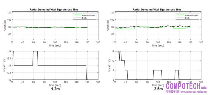 圖 3:使用IWR6843AOP感測器測量的心率和呼吸頻率,該感測器安裝在胸部高度位置,分別距離坐著的人1.2m和2.5m處。