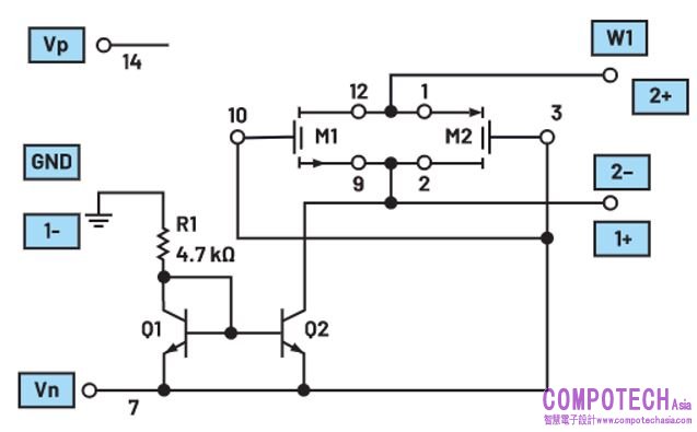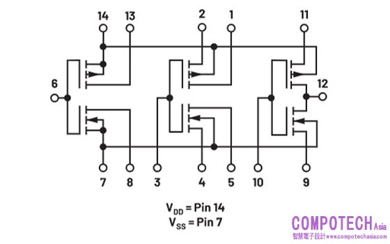 圖1.CD4007 CMOS電晶體陣列接腳排列。