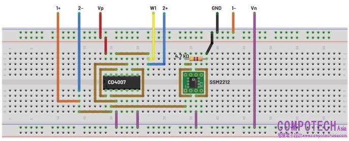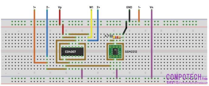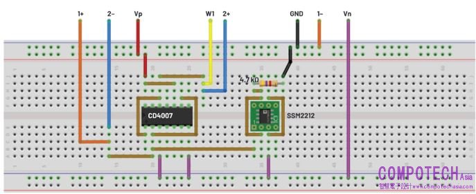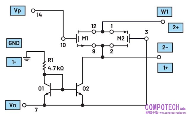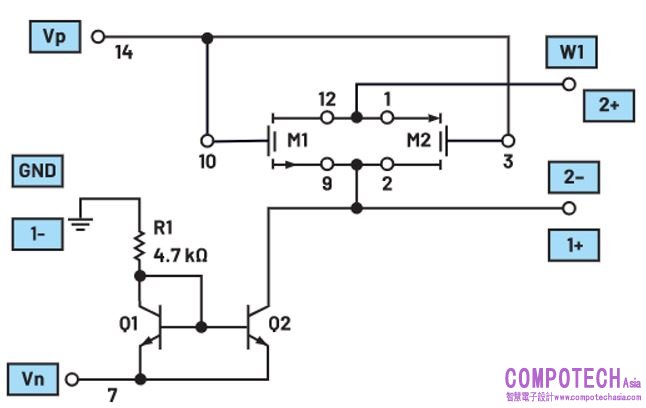 現在,將M1的閘極連接到正電源Vp,將M2的閘極連接到負電源Vn,將電路修改為如圖8所示。在最後一個測試中,NMOS元件M1和PMOS元件M2均導通。