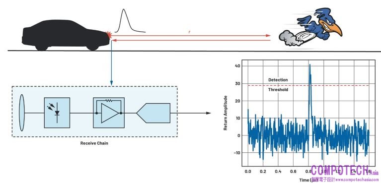 當然,現實世界中不會是這樣的理想狀況。光達的偵測流程會有雜訊 包括接收器各種元件的電子雜訊,以及偵測器本身的光學雜訊。因此,要能偵測到物體,前提是匹配濾波器除了要接收到足夠的光線,還必須能從雜訊中分辨出訊號。