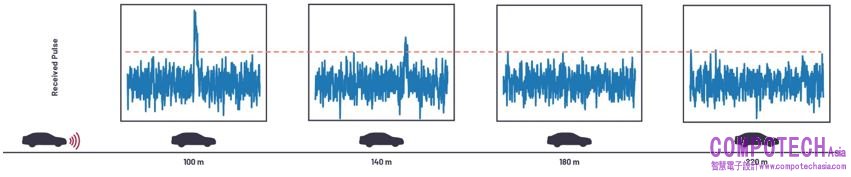也就是說匹配濾波器不容易看見更遠處的物體,在極端狀況下,當物體離得夠遠時,光達系統就看不到該物體。圖3顯示這種情況 折返訊號強度,亦即車輛成像的訊號強度會隨著距離拉遠而快速下滑,在220公尺遠處,訊號的強度基本上就變得和雜訊差不多,會低過偵測門檻而被濾掉。