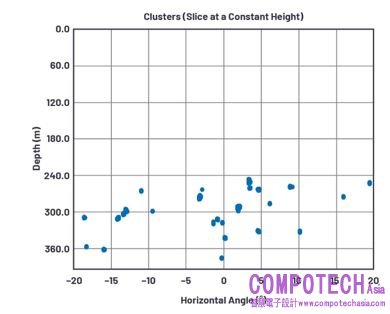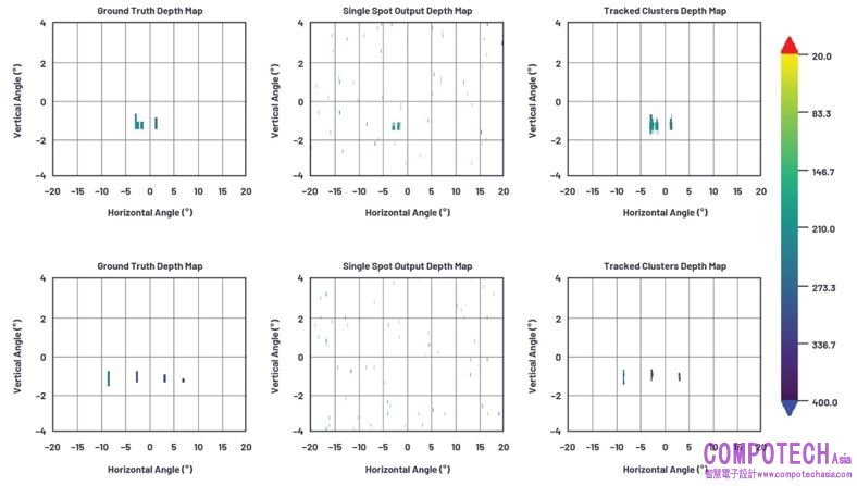 我們可以藉由降低偵測門檻來解決這項問題,讓圖3所示的車輛能看到物體。在特定SNR雜訊比水準下,顯然我們也會偵測到許多雜訊。現在整個3D資料畫格中含有許多閃光(flash)訊號某些是對應到物體,其他的則僅是雜訊。舉一個例子,圖4顯示所有方向(跨門檻)上,光達畫格在某一垂直截面(slice)(固定的垂直角度)的內容。大多數偵測到的訊息只是雜訊,但有部分確實是對應到實際物體。但我們要如何分辨哪些是虛哪些是實? 要辨識單一畫格的訊號就相當困難,但在處理幾個畫格的資料後辨識就會更加容易與可行。