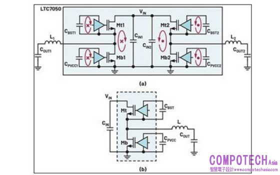 圖 1:SilentMOS LTC7050 具有內部對稱的小型熱迴路,以便大幅減少振鈴,(a) 顯示 LTC7050,(b) 顯示常規 DrMOS 模組