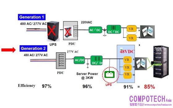 效率提升1%就可以使資料中心節省數千瓦的功率,而第二代電源架構採用48 V(圖 1),I2R損耗降低至十六分之一,同時仍低於UL-60950-1標準的60 V DC安全超低電壓(SELV)限制,超過這個限制就需要採取另外的絕緣、放置空間和測試。為了滿足新的能效要求,企業的資料中心電力方面因此開始採用48 V架構。
