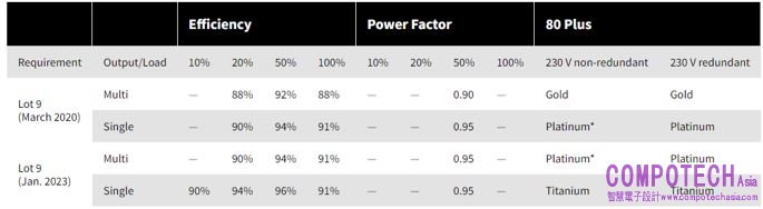 資料中心電源的全球性標準也繼續朝著更高效率的方向發展。OCP開放計算專案3.0進一步最佳化硬體來降低能耗,80 Plus白金和鈦金認證要求,以及歐盟的節能化設計指令標準(ErP)Lot 9項目的法規也在不斷發展(表1)。Lot 9的下一次更新已經安排在2026年1月。