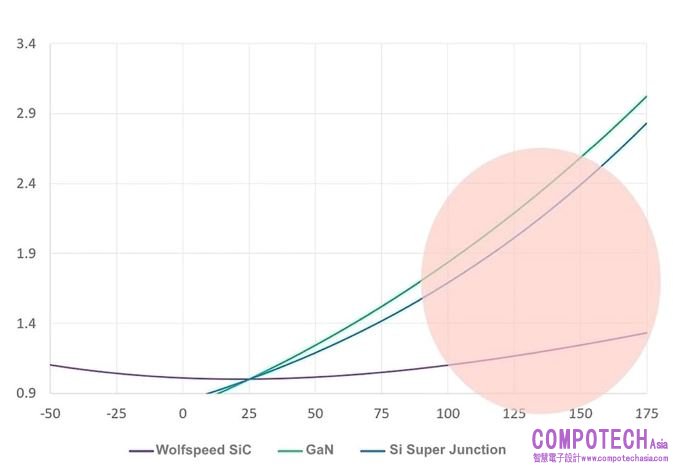 SiC在整個溫度範圍內的RDS(ON)變化最小,因此高溫時的傳導損耗較低。在這種情況下,GaN會顯著滯後,從而抵消低開關損耗帶來的所有優勢。