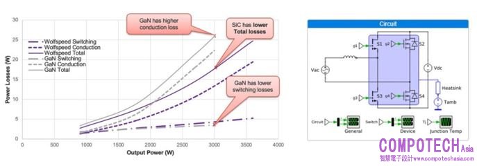 圖 3:在圖騰柱PFC模擬中比較Wolfspeed 60 mΩ SiC與50 mΩ GaN元件的研究。左邊是功率損耗與輸出功率的關係圖,右邊是電路圖。