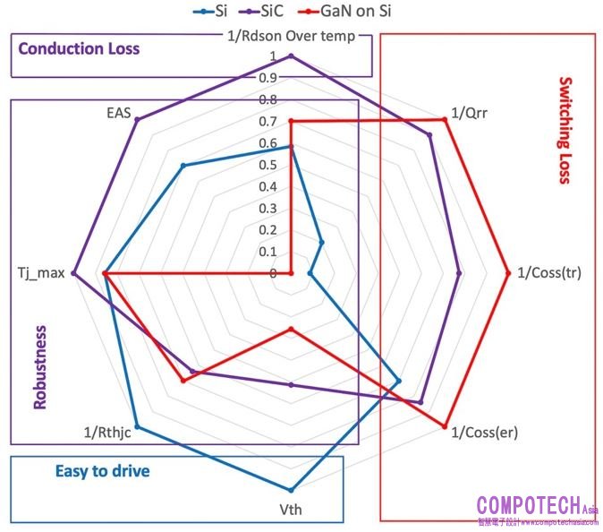 矽的優勢包括結殼熱阻Rthjc最低,因此具有更好的熱性能,以及最高的閾值電壓Vth,可提供更好的抗雜訊能力,使Si元件更易於驅動。請注意,GaN的Vth極低。