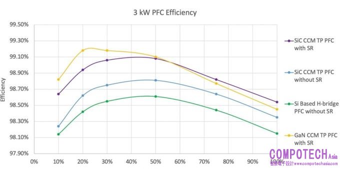 另一方面,SiC在半負載時的效率與GaN相似,在滿負載時效率更高(圖 5)。