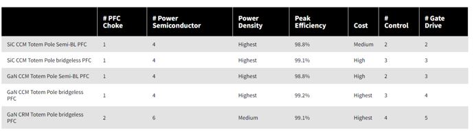 從更廣泛的角度來看,包括SiC和GaN基於CCM圖騰柱PFC的功率密度、元件數量和相對成本(表 2),我們注意到在高功率密度應用中,SiC不僅在效率方面優於GaN,而且在閘極驅動複雜性、控制和成本方面也優於GaN。