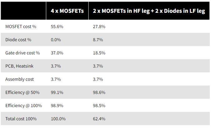 該設計還提供了一定的靈活性,可以犧牲部分高效率以降低成本,但同時仍能滿足上述效率標準(表 4)。低成本選項用二極體取代設計中低頻(LF)管腳的兩個MOSFET,同時保留高頻(HF)管腳的兩個MOSFET。