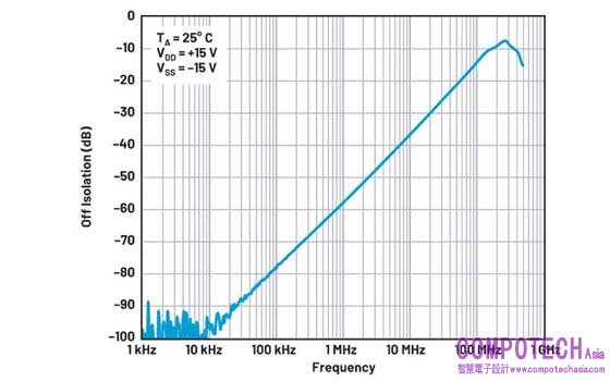 圖1顯示 ADG5412的關斷隔離度與頻率的典型性能圖。該圖顯示,當源極上的訊號頻率上升時,關斷隔離度隨之降低。
