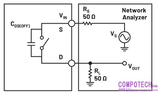 表示隨著訊號頻率增加,源極上有更多訊號會出現在關斷開關的漏極。如果您觀察開關的等效電路在關斷狀態下的表現,如圖2中的測試電路所示,會發現這種狀況不足為奇。當開關處於斷開狀態時,源極和漏極之間存在寄生電容,即圖中的CDS(OFF)。這種寄生電容使高頻訊號能夠通過,關斷隔離圖就是為了確定這些特徵。