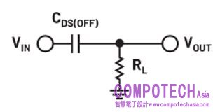 將從關斷隔離圖中得到的結果應用到開路開關的等效電路中,可計算得出CMOS開關的CDS(OFF)。首先,如果考慮關斷開關通道和負載,可以將電路視為高通濾波器,如圖3所示。