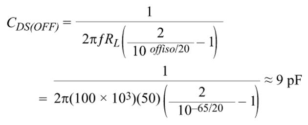 這表示如果知道RL、輸入訊號的頻率f,以及關斷隔離規格值(dB),就可以計算出CDS(OFF)。這些值可以在ADI產品系列中的開關或多工器產品的資料手冊中找到。以下示例將展示其執行步驟。