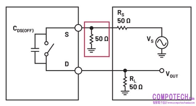 圖4.源極上具有50 Ω端接電阻的關斷隔離度測試電路。