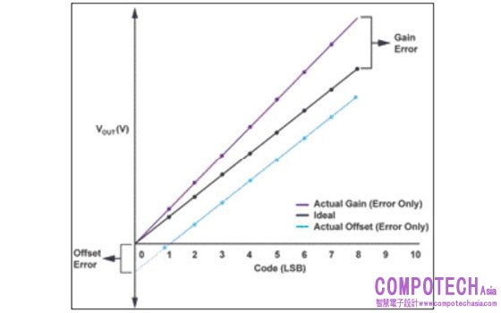 圖 1: 單極性 DAC 的失調誤差和增益誤差的表示。