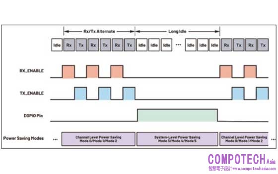 如前一節所述,通道級節能模式會關斷與通道相關的元件,例如資料路徑、RF PLL 和 LDO 穩壓器。在發射和接收通道都處於閒置狀態時,例如處於圖 6 所示的場景下時,系統級元件可以進一步關斷以實現更高節能效益。這些系統級元件包括時脈PLL、轉換器 LDO 穩壓器、時脈 PLL LDO 穩壓器,以及 Arm 處理器及其記憶體。與通道級節能模式類似,提供三種系統級節能模式,更多的模式會關斷額外的系統元件,具體參見表 4。