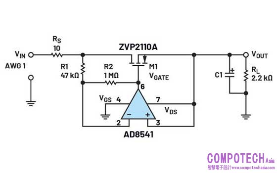 在試驗板上建構圖1所示的簡易半波整流器電路。主動閘極驅動電路使用運算放大器(AD8541)感測來自AWG輸出的交流輸入波形何時高於輸出電壓VOUT(在正值方向上),進而接通PMOS電晶體M1。該電路可以為低至運算放大器最小電源電壓(AD8541為2.7 V)或PMOS元件閘極閾值電壓(ZVP2110A典型值為1.5 V)的交流電壓提供主動整流。在較低輸入電壓下,MOSFET的背閘極到漏極二極體接管,充當普通二極體整流器。