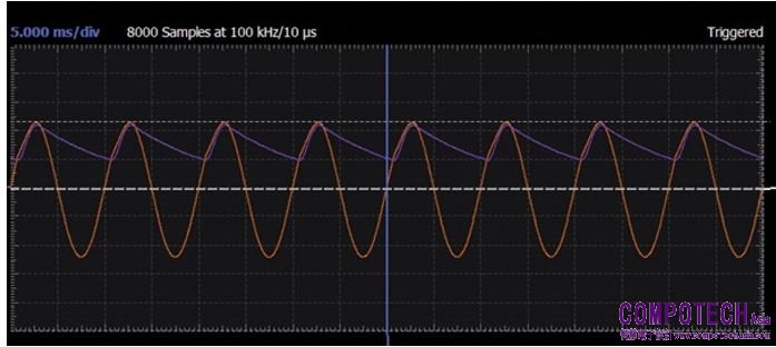 使用兩個示波器輸入監視VIN處的輸入交流波形和VOUT處的直流輸出波形。VOUT應該非常接近VIN的峰值。現在用更小的4.7 µF電容取代220 µF大電容。觀察VOUT處的波形變化。當VOUT的值最接近VIN時,將交流輸入週期的間隔與電晶體M1的閘極電壓進行比較。