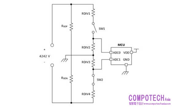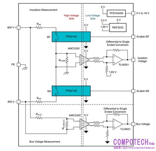 絕緣監控又稱為絕緣檢查、隔離監控、隔離檢查、接地故障偵測或接地故障感測,可監控高電壓終端與保護接地/底盤接地間的絕緣量。圖 1 說明一種絕緣監控配置。絕緣監控電路的基本運作包含切換已知電阻 (RDIV1/2、RDIV3/4) 和系統方程式求解,以找出已知絕緣電阻 (RISOP、RISON)。